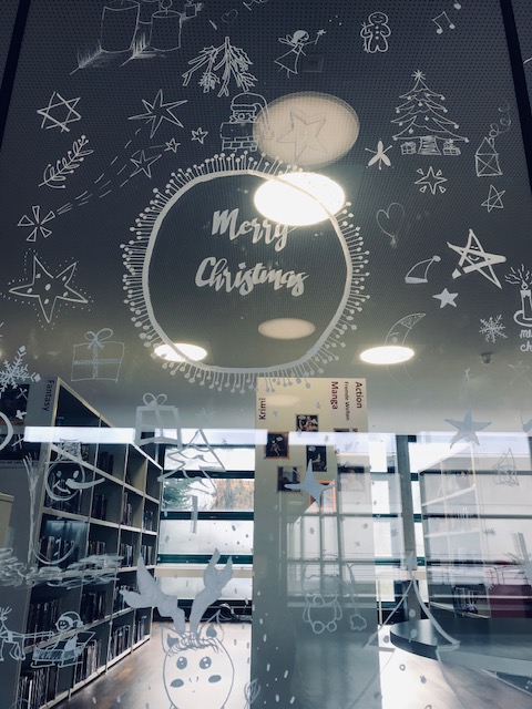 Seit Neustem dürfen LehrerInnen und SchülerInnen am Bibliotheksfenster ihre Weihnachtskreativität frei rauslassen. Jeder darf alles, was mit Weihnachten zu tun hat, zeichnen. Es sieht schon weihnachtlich aus, trotzdem würden wir uns sehr freuen, wenn noch mehr Zeichnungen erscheinen würden. Wenn Ihr neugierig seid, wie das Fenster aussieht, geht zum Lesezentrum und bestaunt die Kunst. Die Stifte zum Zeichnen bekommt ihr bei unsere Bibliothekarin Frau Schaub. Es ist egal, wie schlecht du zeichnest, solange du einen Teil dazu beiträgst.