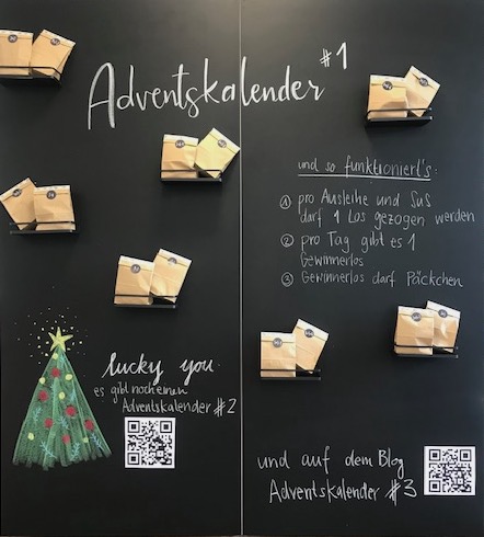 Adventskalender #1 sind kleine Tütchen mit allem möglichen darin. Man bekommt eines, indem man fleissig Bücher ausleiht.